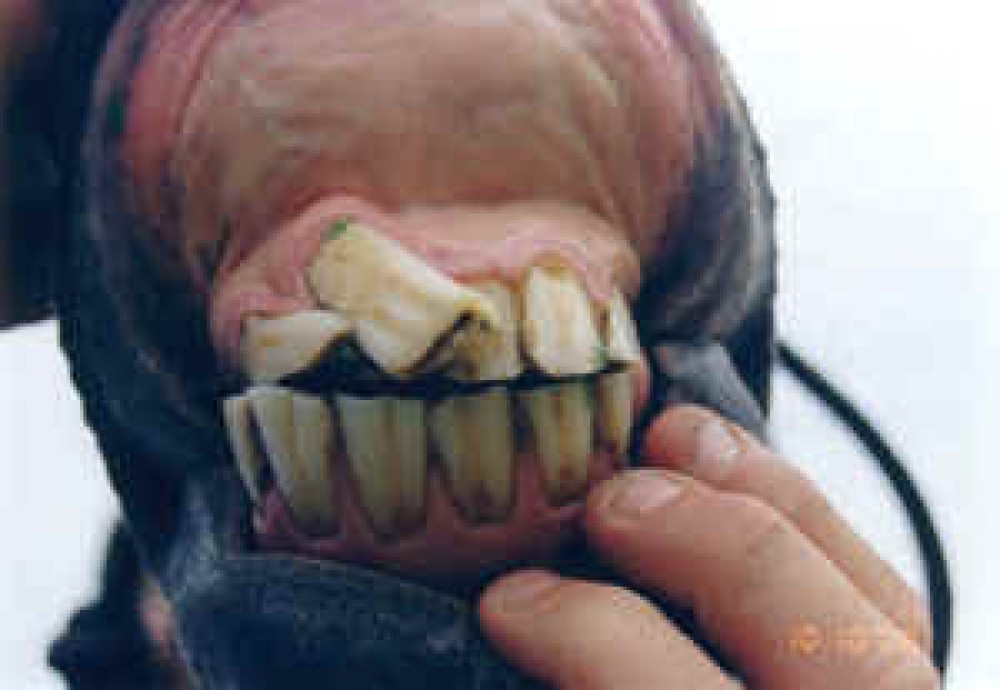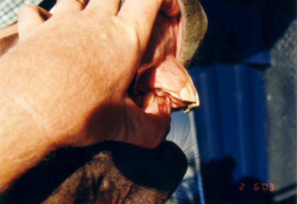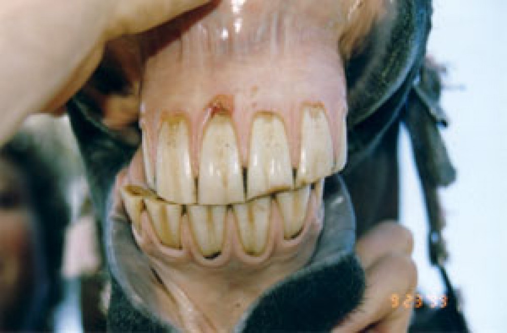 Traumatic avulsion of the incisor teeth. This is a common accident - often the result of a kick, or getting the teeth caught on mesh etc. Treatment of these accidents needs to be prompt, in order to save the teeth and restore them to their normal position.