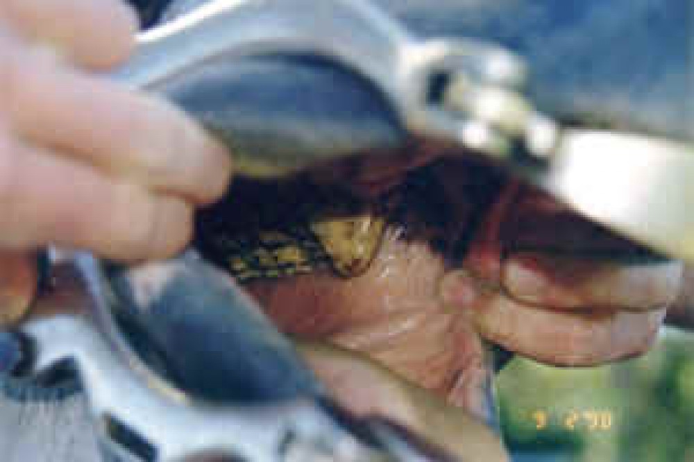 Another role for an equine dental practitioner is to extract wolf teeth. Wolf teeth are small, useless teeth and are positioned just in front (but up to 3cm in front) of the first cheek teeth. The problem with these teeth is that they do have a nerve supply and they can become painful when contacted by the bit - resulting in an intermittent head toss. Another problem is that they get in the way when the dentist is contouring the first cheek teeth in order to set up the mouth to accommodate the bit pain free, ie when doing a "bit seat".
